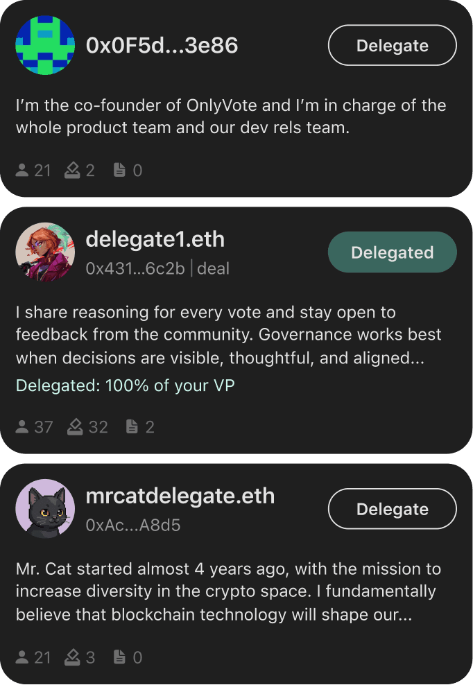 Track all your DAOs, vote on proposals, and manage delegations from one powerful app.