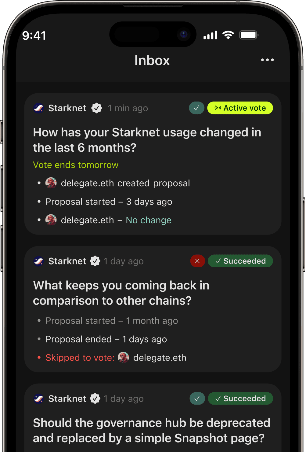 Vote, delegate, and track proposals across all your DAOs. Everything you need to participate in DAO governance from your phone.